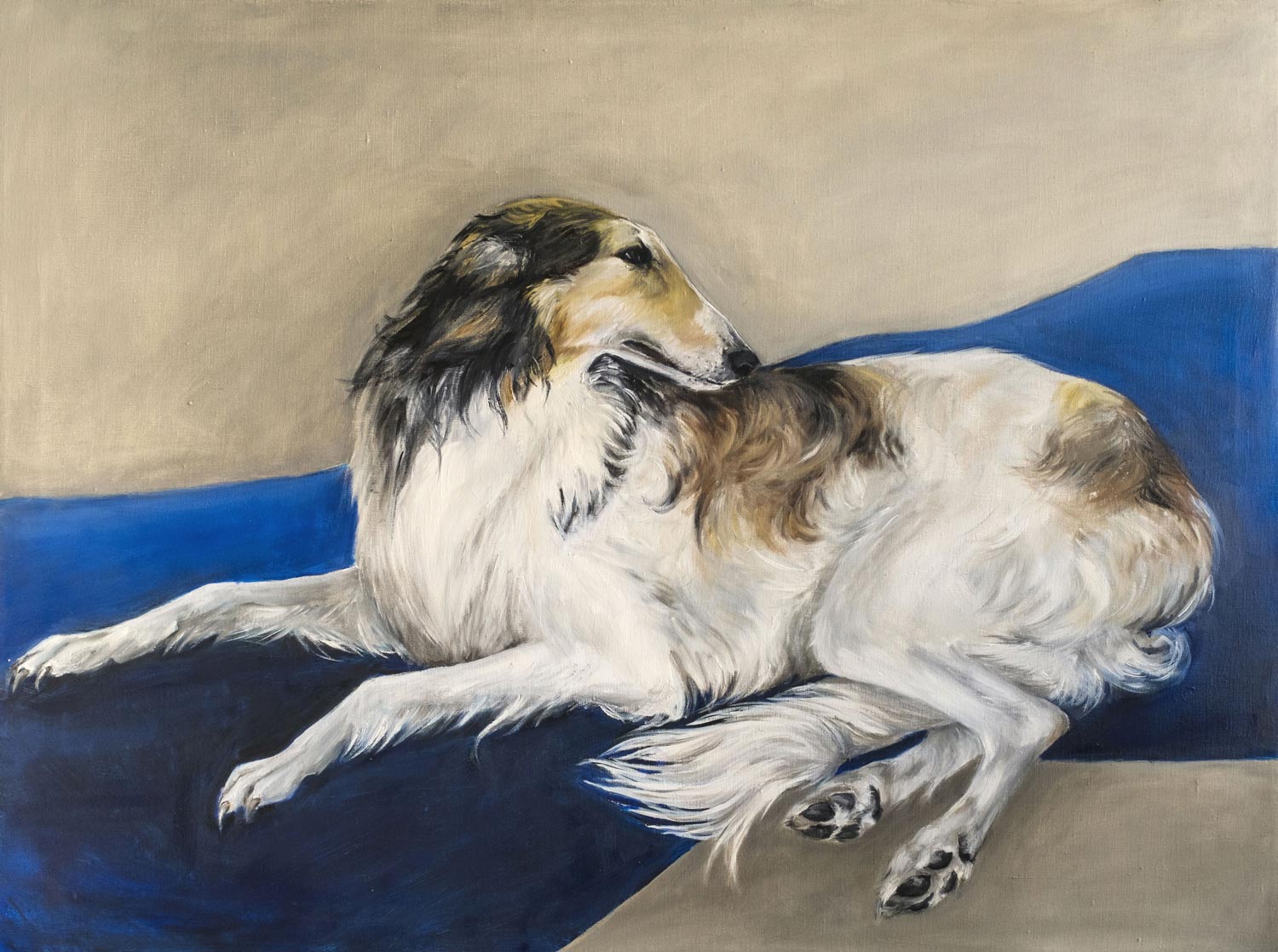 Borzoi is the living embodiment of elegance and speed. It seems these creatures came to us from a parallel fairy-tale world. In my picture, the dog lies calmly, showing its aristocratic profile. But its long, unruly fur and watchful gaze create a sense of tension. A conditionally depicted drapery in deep blue creates additional drama.