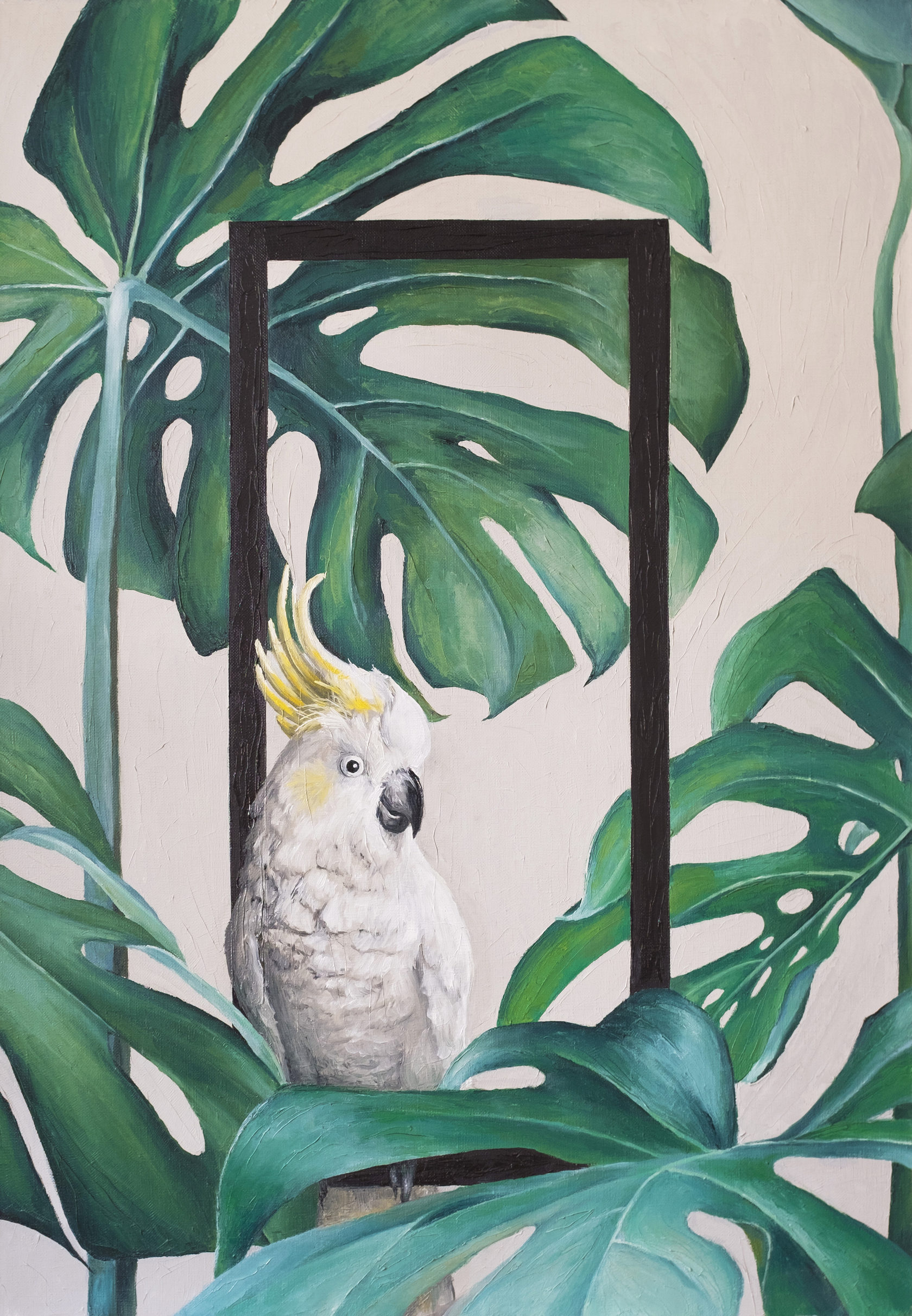 This picture is part of a series in which I explore the relationship between man and nature. Behind a pleasant eye composition and colors, there is a contrast between the aesthetics of natural forms and colors of clear geometry, lines, and contrast, which reflect the delicate balance of human-nature relations. A beautiful and bright parrot is surrounded by leaves and at the same time interacts with the abstract form of a black frame, it is in its environment, but already under the influence of the modern world, in which human intervention is already irreversible.