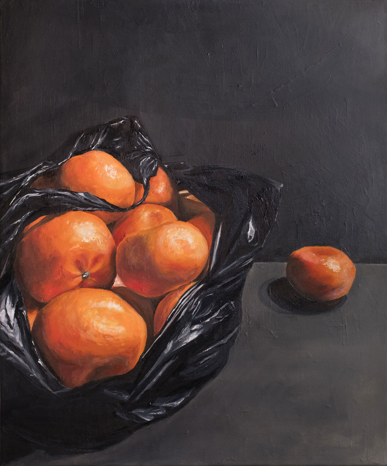 This work is a reference to classic still lifes, where fruits and vegetables are often presented surrounded by beautiful silver plates, vases and precious fabrics. In our daily life, we mostly see fruits and vegetables in plastic packaging or plastic bags. But more and more people become aware of sustainable lifestyle. Perhaps we are not very far from the days when such packaging becomes nothing more than a spectacular part of the decor preserved in the painting.