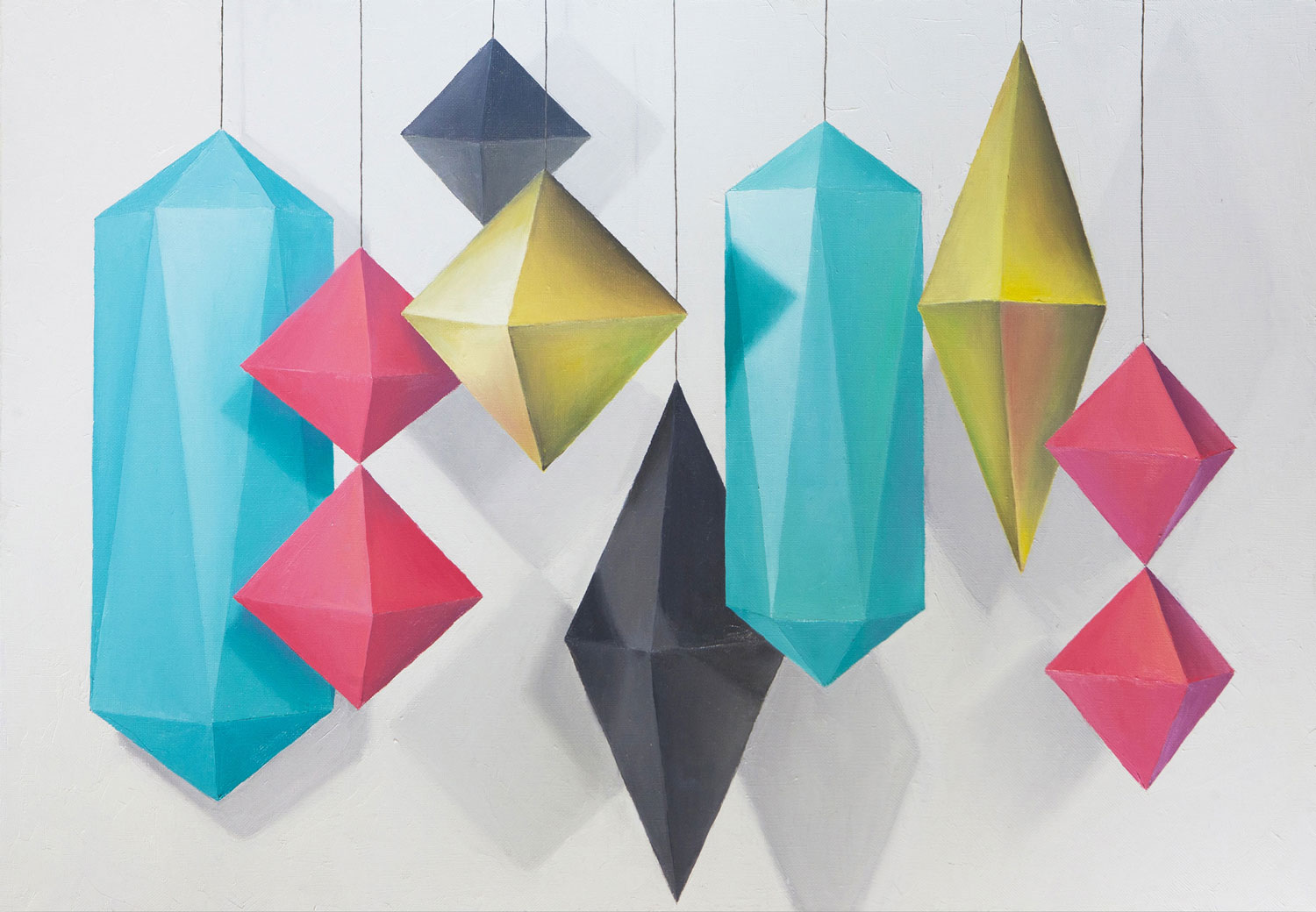 At first glance, each figure in the Polygons 3 still life is a simple set of planar figures that form convex regions using light and shadow transitions. But fantasy draws an image of a bunch of bright gems descending on thin strings from nowhere. The painting is part of the Mobiles series and fits perfectly into the modern interior.