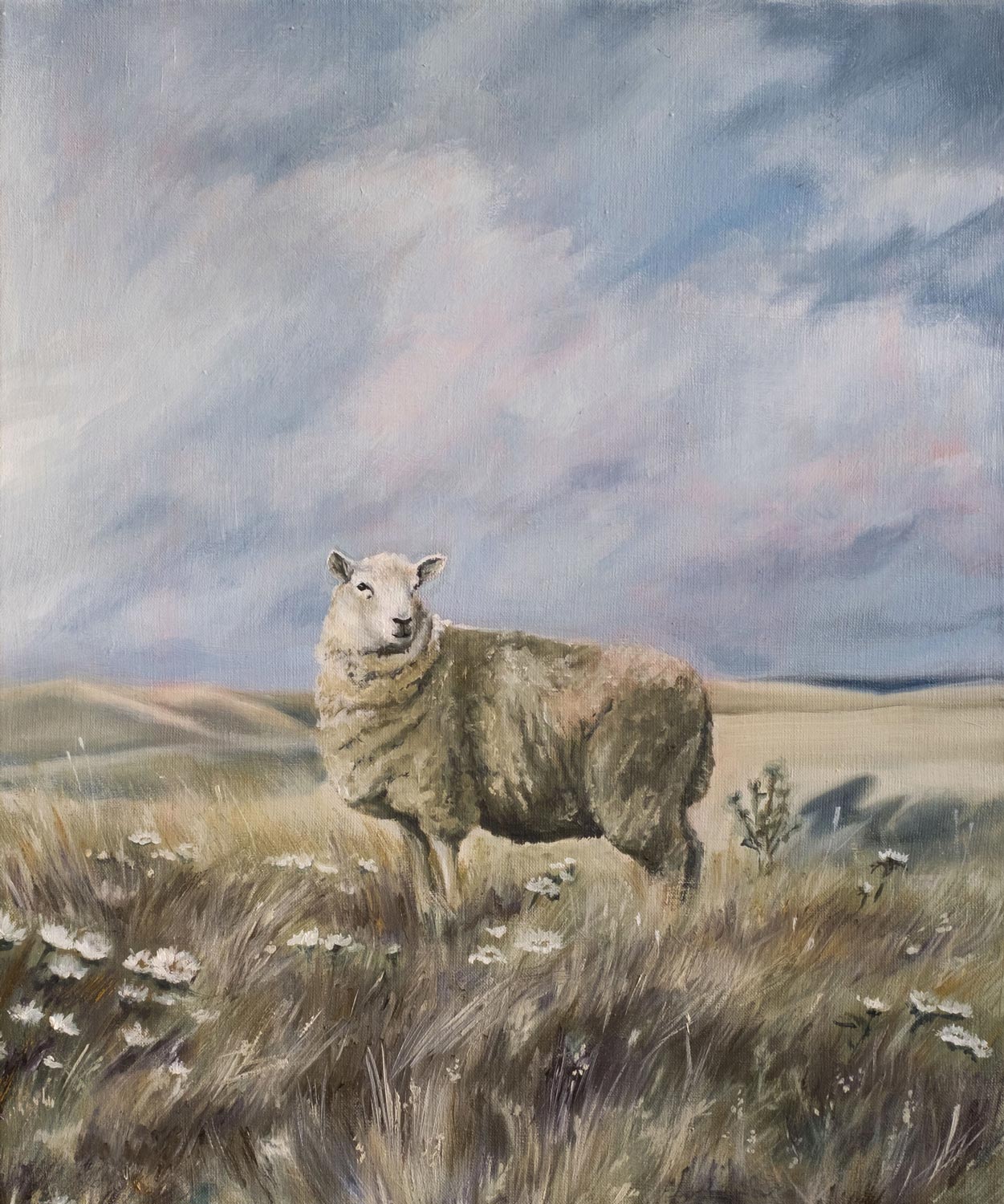 This painting is part of a series of works. This series is my exploration of the image of the sheep in our culture. The image of a sheep is found in Christianity, symbolizing a righteous person following a spiritual pastor. This character is also found in our culture as a stupid and weak-willed person who is easy to manipulate. In my work, I explore this image of a sheep from different angles, in focus, without other animals and shepherds to understand why they are so similar to us.